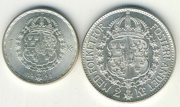 Sverige, 1 kr 1948 TS & 2 kr 1940 G SØLV - KM 814 & 787
