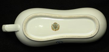 Sjælden saucière fra St. Petersborg, produceret hos Brødrene Kornilovs porcelainsfabrik, ca. 1850. Kanden bærer Ekaterina I´s kronede monogram og skal ifølge overleveringen have været brugt hos militærregimentet der bærer hendes navn. L. 28 cm.