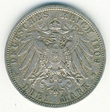 Preussen, Wilhelm II, 3 mark SØLV 1909A - KM 527