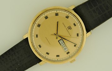 Girard Perregaux Gyromatik herrearmbåndsur, i kasse af guldbelagt stål, forgyldt urskive m. punktindeks, datoangivelse samt ugedag ved 3" position. Automatisk urværk m. manuelt optræk. Ø. 37 mm.