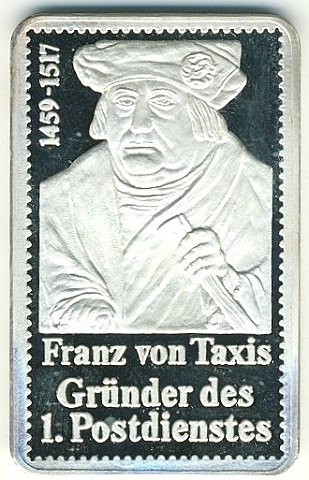 Sølvbarre af finsølv, præget i anledning af 500 året for tysk posttjeneste 1490-1990. På fs. ses et motiv af den Nürnbergske maler, kobberstikker m.m. Albrecht Dürer med titlen "Der kleine Postreiter", på bs. ses portræt af Franz von Taxis(1459-1517), grundlæggeren af den første posttjeneste.