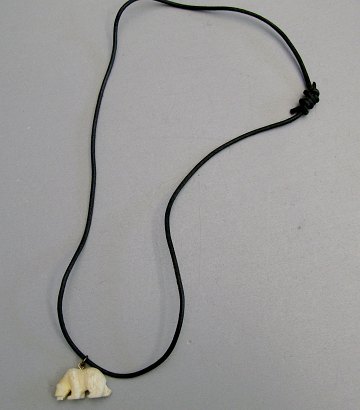 Halssmykke af læder med håndskåret vedhæng af ben. Vedhæng ca. 30 x 18 mm. Halskæde L. 56 cm. Grønland, 20. århundrede.