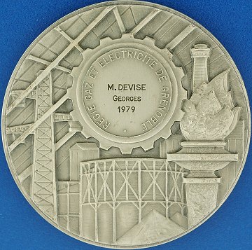 Fransk medaille af sølv, præget på fs. m. "REGIE GAZ ET ELECTRICITE DE GRENOBLE" samt "M. Devise/ Georges 1979", og på bs. m. liggende afklædt kvinde holdende en en fakkel, i baggrunden ses Grenoble Gas- og Elektricitetsværk. Gravør: G. Simon. Ø. 68 mm.