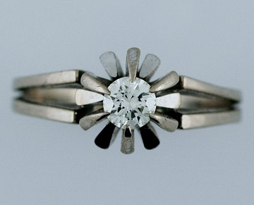 Ring af 4 kt. hvidguld med gennembrudt skinne og forhøjet front, dekoreret med pæn brillant på ca. 0,25 ct. Ring str. 59. Totalvægt ca. 4,3 gr.