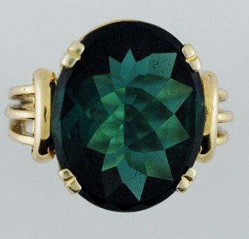 Ring af 14 kt. guld, prydet med stor mørkegrøn, ovalt facetteret kvarts, ca. 18 x 15 mm. Ring str. 50, totalvægt ca. 7,5 gr.
