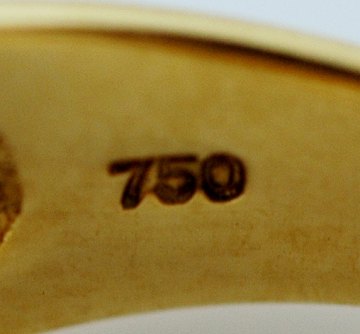 Ring af 18 kt. guld med sløjfeformet, profileret front, dekoreret med 5 pæne, små brillanter. Ring str. 53 1/2, totalvægt ca. 5 gr.
