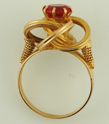 Ring af 14 kt. guld med dobbelt skinne og stor forhøjet front, prydet med diamantsleben, rubinrød kvarts, diam. 7 mm., totalvægt ca. 4 gr.