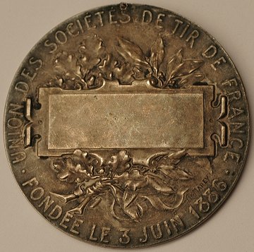 Fransk medaille af sølv, præget på bs. m. sejrsgudinden holdende flag og lauerbærkrans, på fs. står der "UNION DES SOCIETES DE TIR DE FRANCE / FONDÉE LE 3. JUIN 1886.