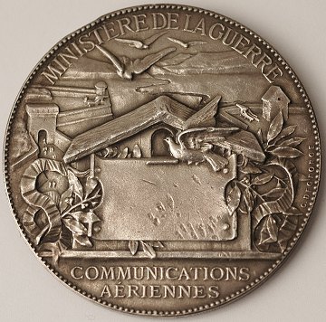 Spændende fransk medaille fra det parisiske Krigsinstituts luftkommunikationsafdeling (brevduer), Paris 1870-71. På bs. præget m. sidden kvinde, der læner sig mod kanon og modtager brevdue m. åbne arme, fs. er præget m. dueslag hvorover der står "MINISTERE DE LA GUERRE" og under "COMMUNICATIONS AÉRIENNES". Gravering udført af C. Degeorge. Ø. 50 mm.