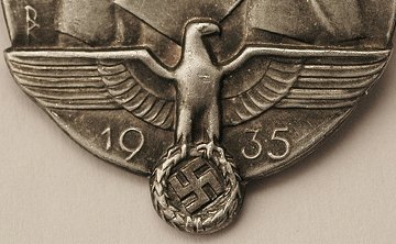 På fs. ses tre arbejdere fra forskellige erhverv, herunder den tyske ørn, svastika samt 1935, over står "TAG DER ARBEIT", på bs. står fabrikanten "FOSTER U. GRAF SCHWÄB. GMÜND". L. 45 mm.