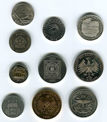 Samling med 10 medailler, heriblandt tysk genforeningsmedaille 1990 og Marshall Islands "First man on the moon".