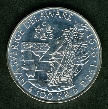 Sverige, 100 kr STERLINGSILVER 1988 (large head) UNC -Delaware 350 years