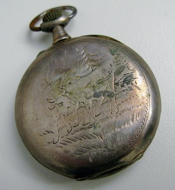 Lommeur af sølv med romertal på emailleskive med separat sekundviser. Bagkapsel dekoreret med 2 kreaturer. Stemplet 0,800, Diam. 48,5 mm. 20. årh. begyndelse.