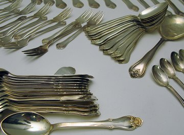 Lot bestående af 12 middagsskeer, 12 middagsgafler, 8 middagsknive, 12 frokostskeer, 12 kagegafler, 9 kaffeskeer, 1 kartoffelske samt 1 pålægsgaffel. desforuden medfølger 15 Atla frokostskeer.