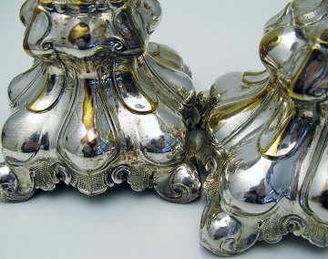 Par stager i barokform, rigt drevet med bukler, volutter og bladværk, udbøjer manchet med buet, svejfet kant. H. ca. 19 cm.