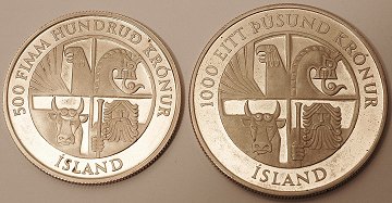 Island, 500 og 1.000 kronur STERLINGSØLV 1974 - KM 20 + 21