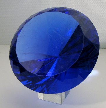 Sten fra vinduesudstilling i form af diamantsleben, safirfarvet glas på udstillingspodie af plexiglas. Diam. 20 cm., Vægt 4,685 kg.