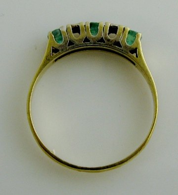 Ring af 14 kt. guld og stedvis rhodineret hvidguld, dekoreret med tre smaragder og to brillantslebne diamanter, tilsammen ca. 0,06 ct. Str. 56, totalvægt ca. 1,9 gr.