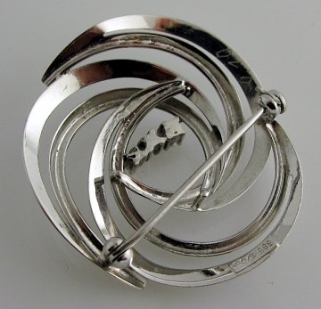 Spiralformet broche af 14 kt. hvidguld, prydet med tre brillantslebne diamanter i forskellig størrelse, ialt ca. 0,10 ct. Broche 35 x 33 mm. Totalvægt 4,7 gr.