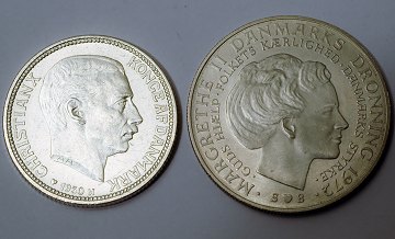 To jubilæumsmønter: Christian X, 2 kr 1930 samt 10 kr 1972.