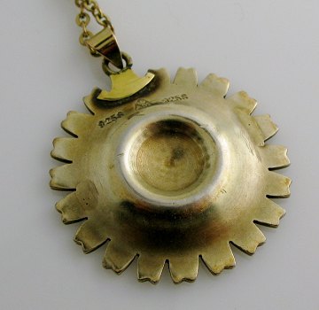 A.M vedhæng i form af emaillebelagt marguerit med kæde af gulddoublé, L. ca. 48 cm. Vedhæng Diam. ca. 33,5 mm. Totalvægt ca 11,5 gr.