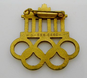 Nål af emaillebelagt metal i form af Brandenburgertor og de fem olympiske ringe. Bagsiden fremhævet mærket W.D. og Ges. Gesch. patentbetegnelsen "Gesetzlich Geschützt". Ca. 35 x 30 mm.