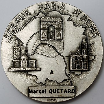 Veludført fransk medaille af sølv, præget i anledning af venskabet mellem de tre Seine-byer Sceaux, Paris og St. Denis. Gravør: R.B. Baron. Ø. 50,2 mm.