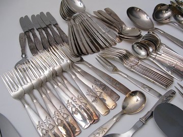 ABSA bestik af sølvplet bestående af 12 middagsgafler, 12 middagsskeer, 12 kagegafler, 4 frokostskeer, 6 frugtknive, 14 theskeer samt 3 dele serveringsbestik. Derudover medfølger et utal bestikdele i forskellige mønstre m.v. plus 2 kagespader, 1 middagsske og 1 kagekniv af sølv.