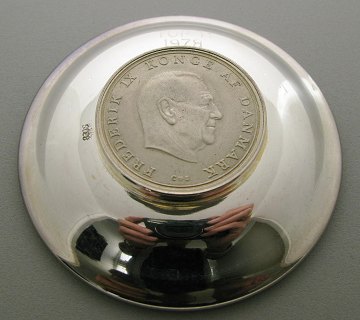 Skål af sølv med jubilæumsmønt 10 kr. SØLV 1968