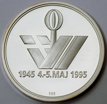 Smuk medaille af FINSØLV, præget i anledning af 50 året for Anden Verdenskrigs afslutning.