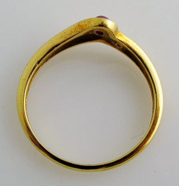 Ring af 14 kt. guld, dekoreret med cabochonsleben rubin og mindre diamant på ca. 0,01 ct. Str. 49, samlet vægt ca. 1,4 gr.