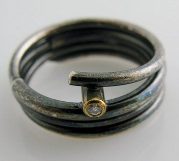 Spiralformet ring af sterling sølv, prydet med mindre brillantsleben diamant, ca. 0,02 ct. Str. 50, samlet vægt ca. 4,2 gr.