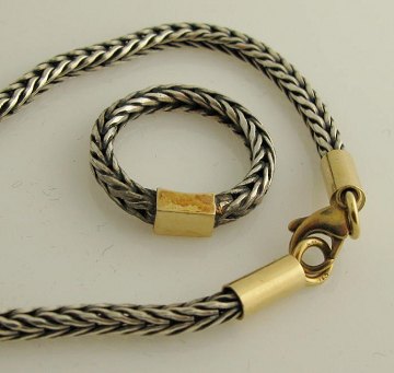 Smykkesæt bestående af armlænke og ring af flettet sterling sølv med lukke og pynt af forgyldt sølv. Armlænke L. ca. 17,5 cm. Ring Str. 50, samlet vægt ca. 11,8 gr.