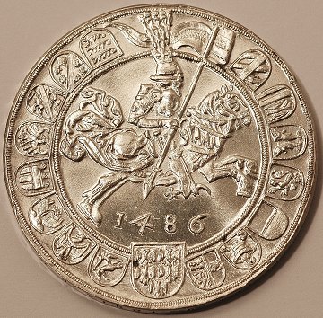 Nyprægning af sølv, 1953, af denne smukke "Tiroler thaler", præget under Sigismund(1439-1496) i det Römiske-Tyske rige. Ø. 40 mm.