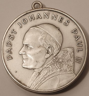 Medaillon af forsølvet metal m. pave Johannes Paul II på fs. og bibelsk figursceneri m. teksten: "Ach Kind Lein was bist du so Schwer" på bs. Kan åbnes til gemme. Ø. 41 mm.