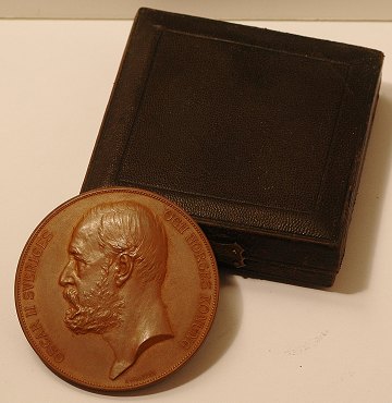 Svensk medaille af bronze, præget i anledning af Industri- og kunstudstillingen i Malmø i 1896. På fs. ses et portræt af Oscar II. Ø. 55 mm.