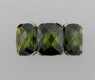 Ring af massiv Sterling sølv, prydet med 3 smaragdfarvede, harleqinslebne sten. Str. 54, Samlet vægt ca. 11,3 gr.