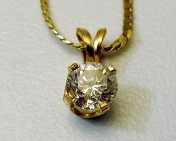 Vedhæng og halskæde af 14 kt. guld, dekoreret med brillantsleben diamant, ca. 0,70 ct. Vedhæng L. ca. 12 mm., halskæde L. ca. 44 cm. Samlet vægt ca. 2,7 gr.