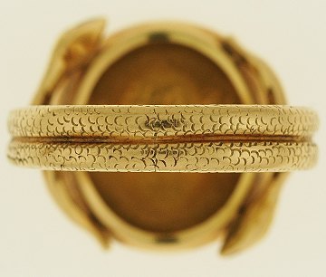 Veludført "doktor-ring" af 14 kt. guld, prydet m. Pallas Athenas portræt og slanger der snoer sig. Indvendig stemplet m. krone og FH for Kgl. Hofleverandør Frantz Hingelberg, Århus. Str. 70.