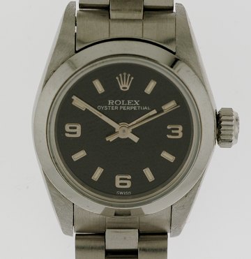 Klassisk damearmbåndsur fra Rolex ref. 67180, i kasse af stål m. oysterlænke ligeledes i stål, sort skive m. både stregindeks og arabertal, automatisk urværk. Ø. 24 mm.