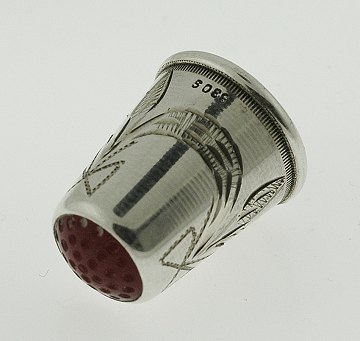 Fingerbøl af sølv dekoreret m. sløjfer samt rosafarvet flus. Indvendig forgyldt. Stemplet 830.