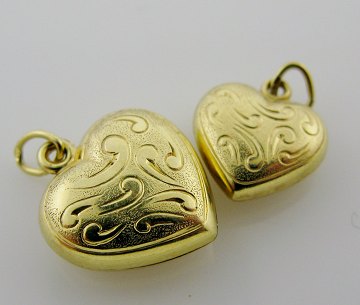 Par vedhæng af 8 kt. guld, bestående af større og mindre hjerte med dekorationsgravure, henholdsvis L. 14 og 11 mm. Samlet vægt ca. 1,0 gr.
