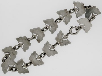 Fin lille armlænke af sterlingsølv fra Volmer Bahner & Co, udført som sammenhængende sommerfugle, prydet m. lyseblå emalje. Stemplet "VB STERLING DENMARK". L. 16 cm.
