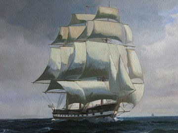 Willy Bille, signeret oliemaleri på lærred med Fregatten Jylland, 74 x 96 cm.