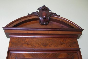 Entrespejl af poleret mahogny med bundkonsol på 2 ben. Buet, profileret top, dekoreret med madaillonskæring. derudover medfølger den 3-delte ampel og to tilhørende væglampetter med opaline glas.