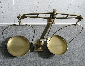 Gedigen købmandsvægt af messing med to skåle og målepind med skala. H. 51 cm. B. 53 cm., 20. årh.