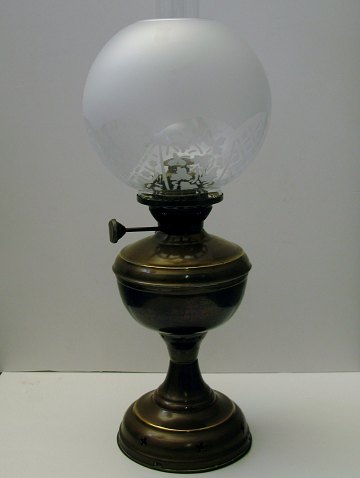 Petroleumslampe af messing på rundt, profileret fodstykke, herover petroleumsbeholder og brænder. Kugleformet yderglas med slibninger i form af stjerner og vinranker. H. med glas ca. 52,5 cm.