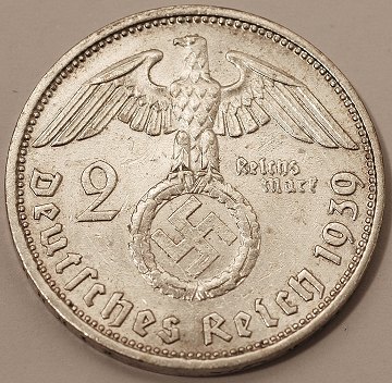 Tyskland, Tredje Rige, 2 mark SØLV 1939A - KM 93
