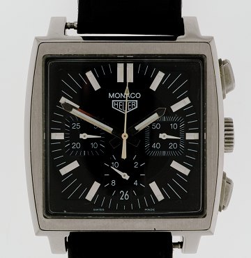 Herrearmbåndsur fra Tag Heuer, model Chronograph Monaco Automatic, luksusudgave i kasse af stål, sort skive m. stregindeks, sølvtonede visere, safirglas og talindikatorer, dato og chronometerfunktioner. Vandtæt til 30 mtr. Fremstår m. sort læderrem. Ø.38 mm.