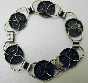 Skønvirke armlænke af sølv i form af blomsterranke, hvorimellem kædeled. L. ca. 18 cm. Vægt ca. 9,5 gr.